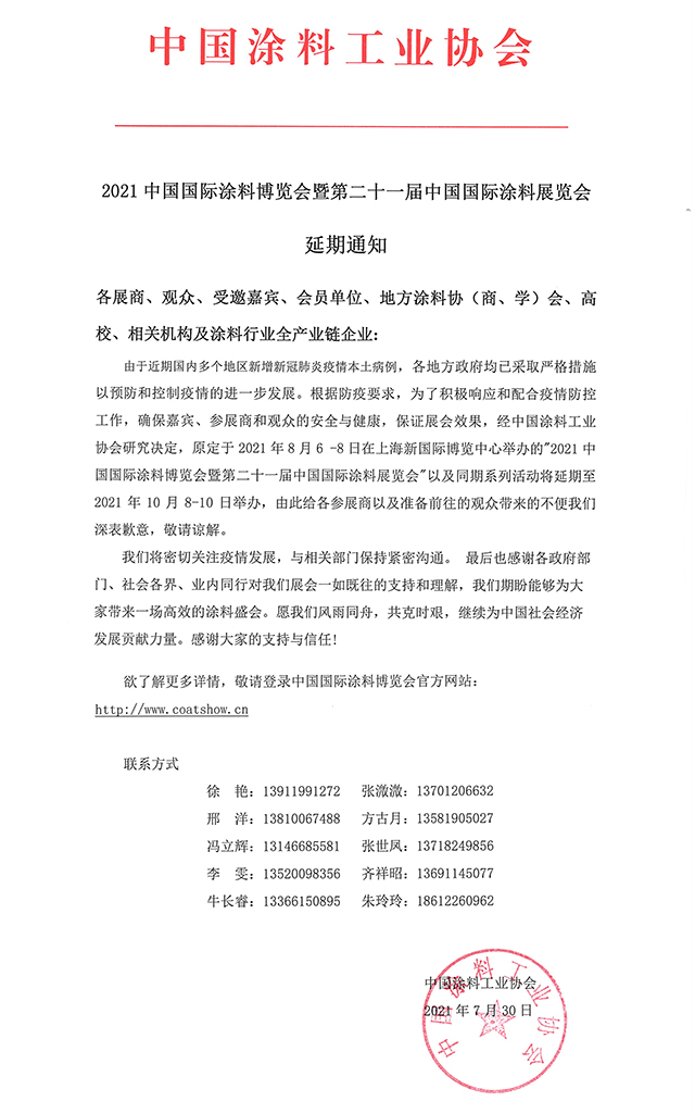 由于近期国内多个地区新增新冠肺炎疫情本土病例,各地方政府均已采取严格措施以预防和控制疫情的进一步发展。根据防疫要求,为了积极响应和配合疫情防控工作,确保嘉宾、参展商和观众的安全与健康,保证展会效果,经中国涂料工业协会研究决定,原定于2021年8月6-8日在上海新国际博览中心举办的"2021中国国际涂料博览会暨第二十一届中国国际涂料展览会"以及同期系列活动将 延期至2021年10月8-10日举办 ,由此给各参展商以及准备前往的观众带来的不便我们深表歉意,敬请谅解。