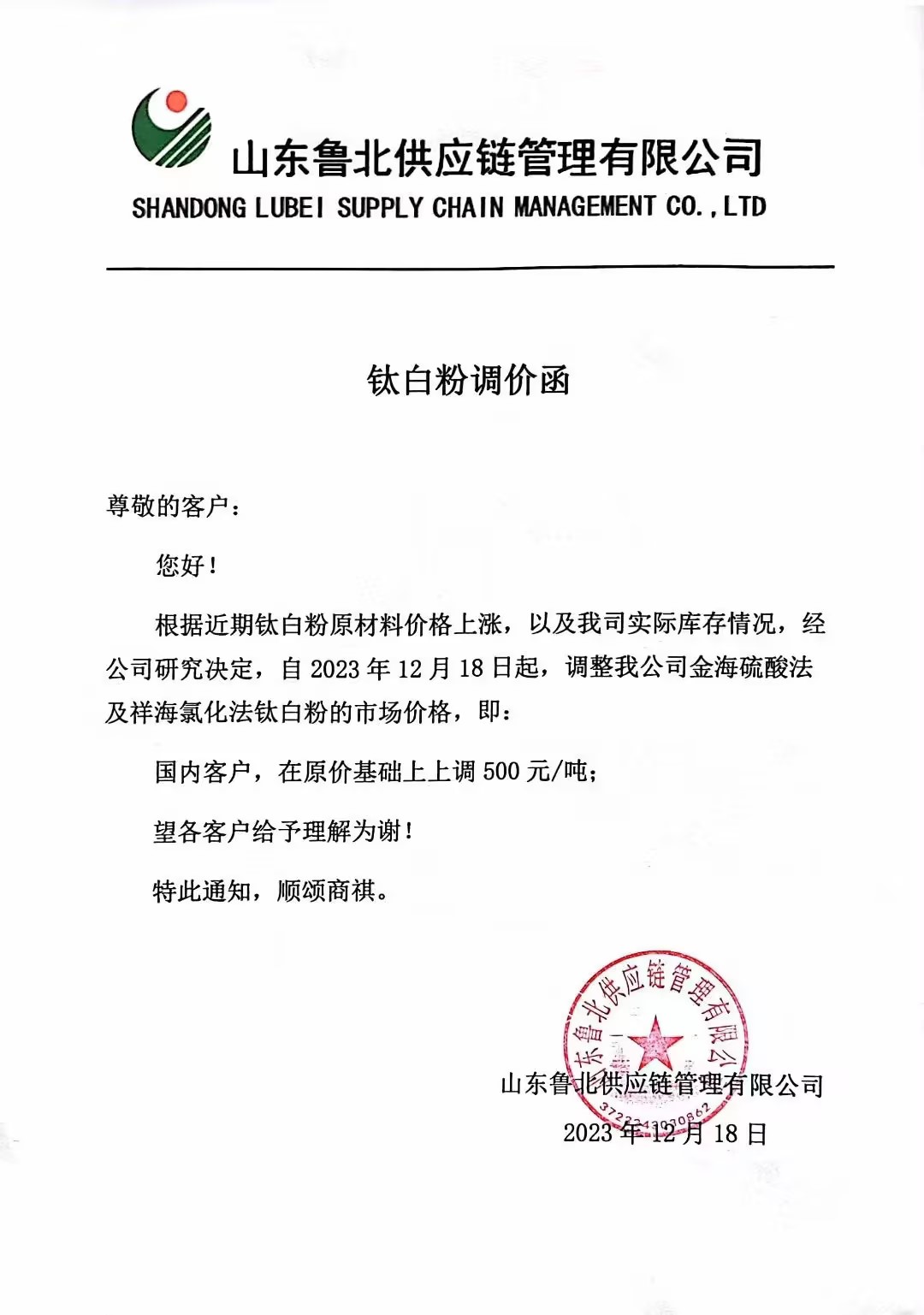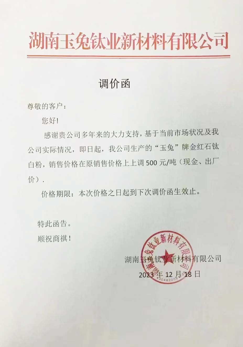 12月18日公告:山东鲁北、湖南玉兔宣布上调钛白粉销售价格500元/吨。