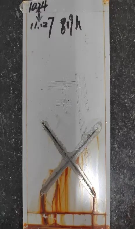 819h板面局部较密集小泡,划痕附近较密集小泡,划痕锈蚀轻微,湿附着力好