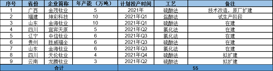 今年新增的产量主要新增产能释放,龙蟒佰利联、中核钛白、山东东佳、贵州胜威等。