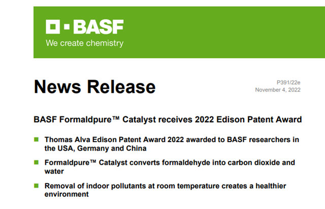 近日,中外涂料网获悉,巴斯夫研发团队凭借创新的Formdpure™催化剂获得新泽西州研发委员会颁发的2022年托马斯•阿尔瓦•爱迪生专利奖,该催化剂可在正常室温下将甲醛转化为二氧化碳,改善室内空气质量。