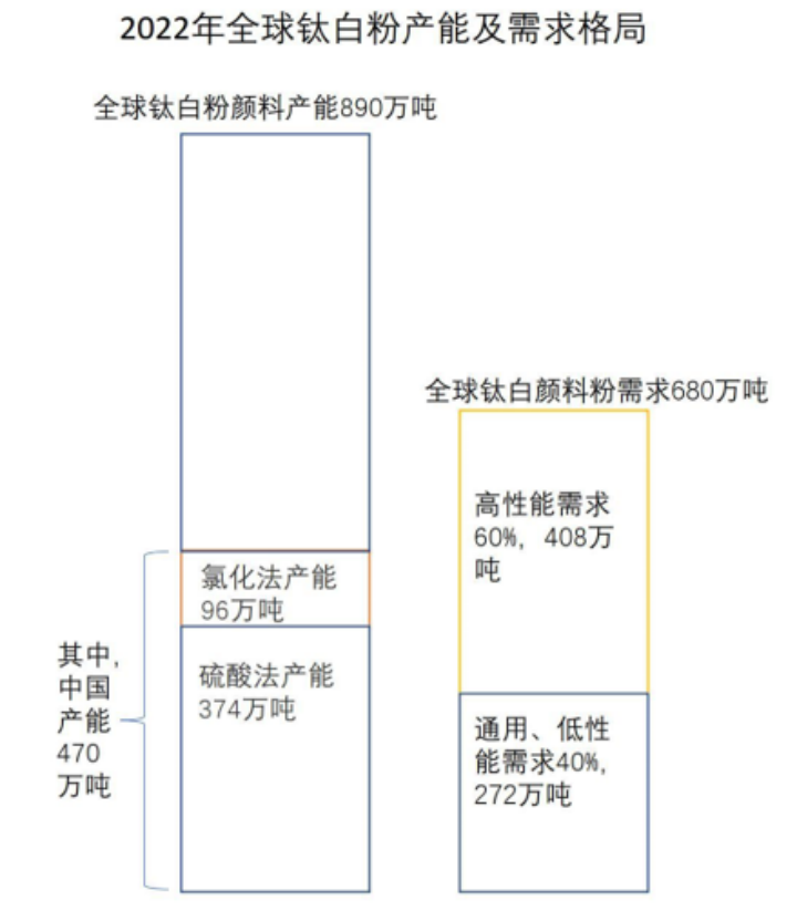 作为大宗原材料的钛白粉市场竞争激烈,产能远大于需求。科慕分析称,全球680万吨需求量的60%系对高性能钛白粉颜料的需求,而造成产能过剩的重要原因是结构的错配。“我们认为,高性能(氯化法)钛白粉颜料产能利用率远高于通用、低性能钛白粉颜料的产能利用率。”科慕在其2022年年报中表示。