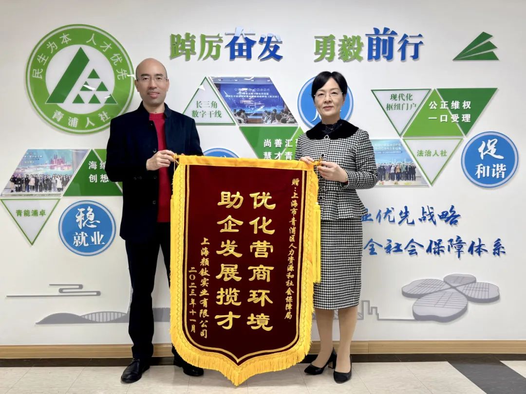 11月14日下午,上海颜钛实业有限公司(下称颜钛)副总裁刘敏和人事行政部总监卜春丽,将一面印有“优化营商环境 助企发展揽才”的锦旗送到青浦区人社局,用最真诚、最真挚的方式,向青浦区人社局提供的人才校招服务表示感谢。