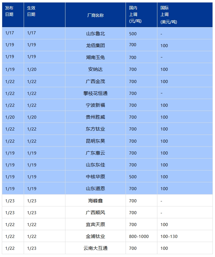 颜钛云商:钛白粉生产商涨价函汇总(1.23)
