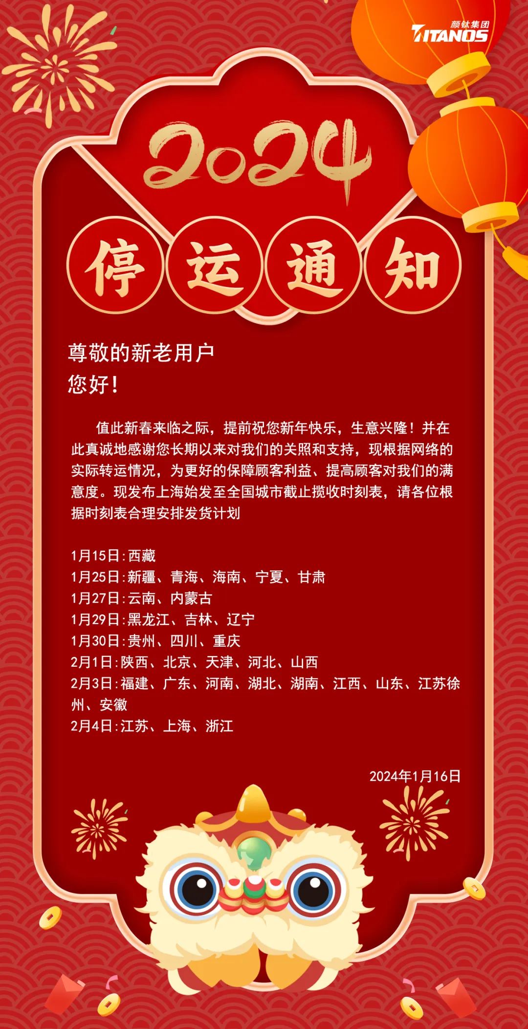 时至1月下旬,经过一轮20多家生产商先后调价的涨价潮之后,钛白粉的价格市场基本进入阶段性平稳期,但临近春节,物流运输即将停运,运输车逐渐减少,运费几乎每天都有变化,整体呈上升趋势,且运送周期拉长。据颜钛云商消息,某大型物流公司已发布春节停运通知,最早已于1月15日停运,各地物流停运时间表大体如下: