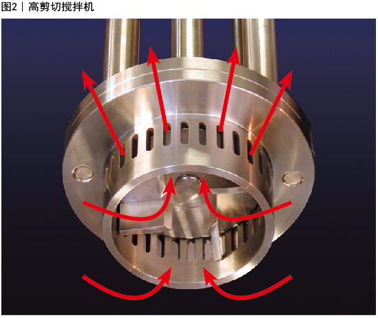 高剪切搅拌机是用于更具挑战性的固液分散体和乳液的转子/定子搅拌机,这些高速分散机不能进行充分处理。这种类型混合装置的典型特征是四叶片的转子在静止的定子内高速转动。当叶片旋转时,物料被连续地抽入搅拌头,并通过所述定子(图2)的开口部位将气体高速排出。由此产生的液压剪切能促进快速均化、解聚和乳化。典型的转子尖端速度是3000~4000英尺/分钟。