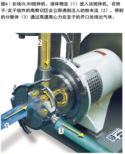 SLIM技术在批量或在线结构中都使用(图3和4),这使得它易于为大多数现有工艺进行翻新。它通常处理的固体负载量高达70%,这取决于该用途,同时能在宽的黏度范围内操作:粉末注入期间,从水状样至黏度高达10000厘泊。