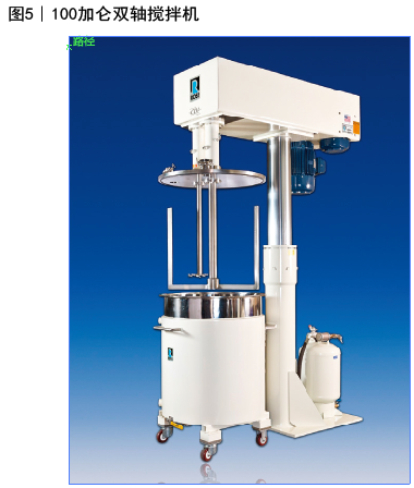 最简单的结构是双轴搅拌机,其特点是有一个低速锚和高速锯齿状分散叶片(图5)。在锚式搅拌器的翼通常包括可调式刮壁刀来擦拭容器底部和侧壁。除了能提高产量外,还能进行更严格的温度控制。