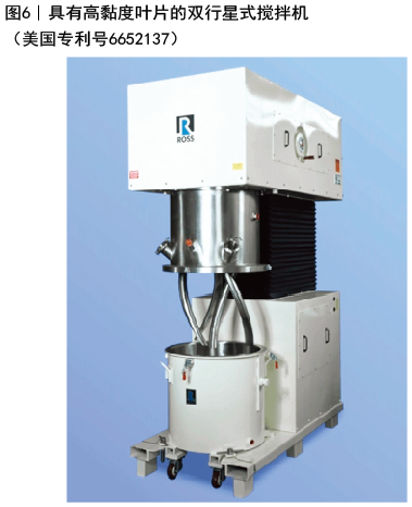 另一方面,传统的双行星式搅拌机(DPM)对于半固体状物料或者高黏度浆状物的熔融和揉捏来说是理想的搅拌机(图6)。虽然不被认为是高速搅拌机,DPM配备有两个相同的搅拌器,当批料量达到相当高的黏度时,能提高剪切水平。在这个非常强健的机器中,一个通用的处理技术是高黏度混合以确保获得令人满意的固体分散体(从200万厘泊到高达约600万厘泊),接下来是调漆步骤,直到循环结束。
